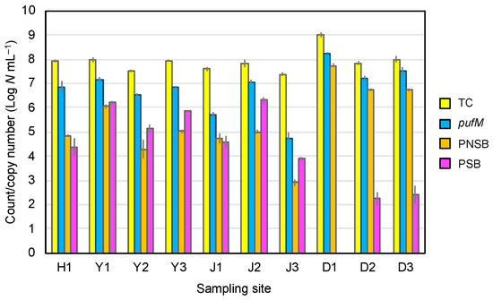 In interpreting the data in Figure 4, not only the marked differences in environmental and biotic conditions between the coastal environments and wastewater ditches (e.g., salinity, effects of co-existing microorganisms), but also the cultivation biases in counting PNSB should be taken into account. Despite these possible biases and factors, there was a highly positive correlation (p < 0.001) between the sum of PNSB and PSB viable counts and the number of pufM gene copies detected (Figure S4), suggesting the significance of the data shown in Figure 4.