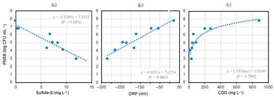 To know about environmental factors affecting PNSB populations in blooming phenomena, we investigated the relationships between viable PNSB counts and sulfide concentrations, ORP, or organic matter concentrations expressed as COD. As shown in Figure 4, the PNSB count had a significant negative correlation with sulfide-S (p < 0.001). Also, the PNSB count had significant positive correlations with ORP (p < 0.001) and COD (p < 0.005). No significant correlations at p < 0.05 levels were noted between the PSB count and these physicochemical parameters.