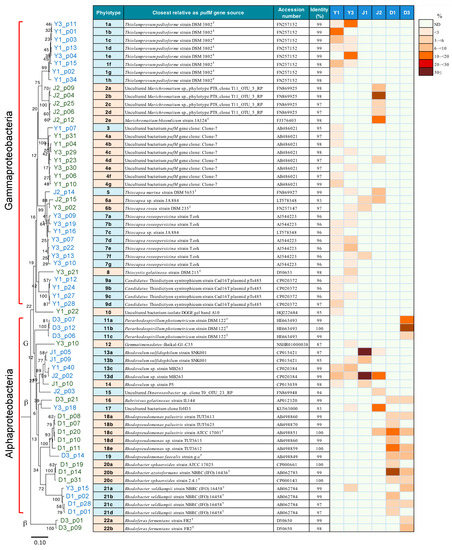 Neighbor-joining phylogenetic tree of the 64 unique pufM gene clones, divided into 22 major phylotypes, the assignment to their closest relatives, and a heat map showing their percentage distribution in six selected blooms/mat samples, Y1, Y3, J1, J2, D1, and D3. Chloroflexus aggregans DSM 9485T (accession number, CP001337) was used as an outgroup to root the tree. The percentages of bootstrap confidence values by 1000 replications are given at the nodes of the tree. The letters G and β with shaded parts in the phylogenetic tree shows the lineages of Gemmatimonadetes and Betaproteobacteria, respectively. Scale bar = 0.1 substitution per position.
