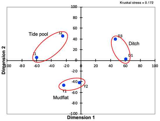 Multidimensional scaling of D matrix data showing differences in pufM phylotype composition among the six selected samples taken from mudflat (Y1 and Y2), tide pools (J1 and J2), and wastewater ditches (D1 and D3). The distance between samples are shown by blue dots.