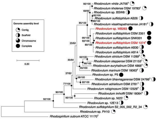 Maximum likelihood phylogenomic tree based on UBCGs (concatenated alignment of 92 core gene sequences) showing genealogical relationships between Rhodovulum sp. MB263 and Rdv. sulfidophilum DSM 1374T (shown by red letters) or other members of the genus Rhodovulum. The database accession numbers for the sequences incorporated are shown in Table S2. The genome sequence of Rhodospirillum rubrum ATCC 11170T was used as an outgroup to root the tree. Gene support indices and percentage bootstrap values are given at the nodes of the tree. Scale bar = 0.2 substitution per position.