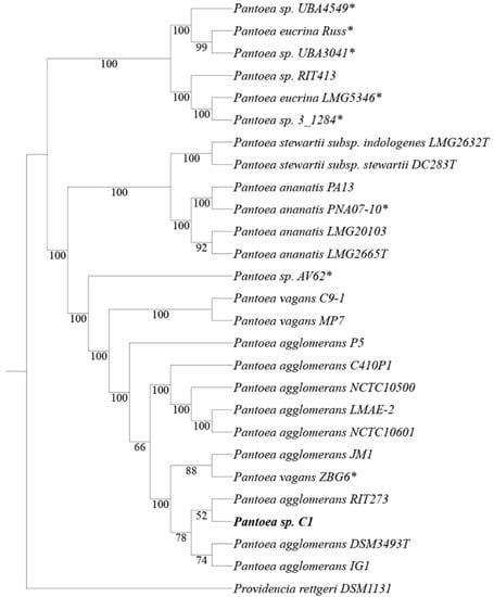 Whole-genome phylogenetic analysis revealed that strain C1 clustered in the same clade which includes P. agglomerans type strain DSM3493 (Figure 1).