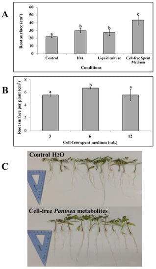 When the cell-free supernatant collected from these cultures was used, the increase in root growth was even more remarkable (2-folds compared to water control and 1.45-fold compared to commercial IBA; Figure 2, panel A). The overall effect was found to be dose-dependent and, at higher doses, the increase in root surface was less pronounced (Figure 2, panel B).