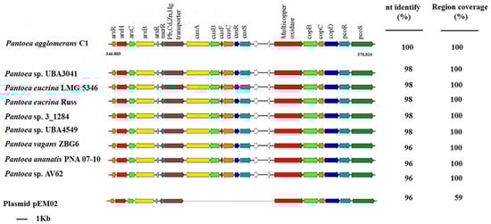 Interestingly, most of the genes involved in tolerance against heavy metals are clustered in a 23.9-Kb region on contig 2 (endpoints: 346889–370816; Table 5) and are included in one of the GI supported by all computational methods of IslandViewer 4 (Figure S1). A genome-mining analysis showed that this gene cluster from P. agglomerans C1 existed in eight Pantoea strains belonging to different species (P. eucrina, P. ananatis and P. agglomerans; Figure 1). Regardless of the absolute genetic distance among the genomes, the structure of the heavy metal resistance gene (MRG) cluster was conserved, and the overall nucleotide sequence identity of the 23.9-Kb region ranged from 96% to 98% (Figure 3).