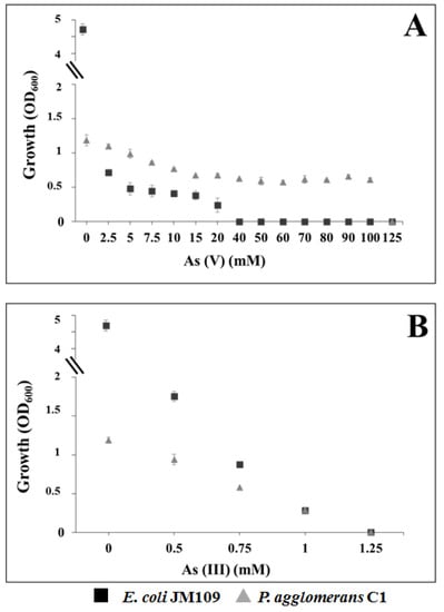 Growth of P. agglomerans C1 and E. coli K12 derivative JM109 in LB medium supplemented with increasing concentrations of arsenate, As(V) (A), and arsenite, As(III) (B).
