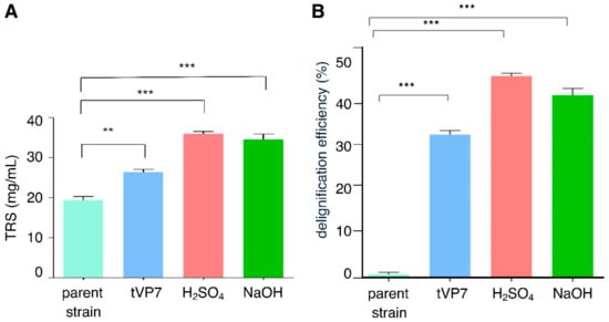 Lignin quantification after the different pre-treatments was carried out according to the method cited earlier []. The maximum delignification of 46.95% was achieved during dilute acid pre-treatment (5% v/v H2SO4) followed by alkaline pre-treatment (5% w/v NaOH), which achieved delignification of 43.72%. The transformed T. reesei Rut-C30 strain tVP7 achieved a delignification efficacy of 32.68% (Figure 2B).