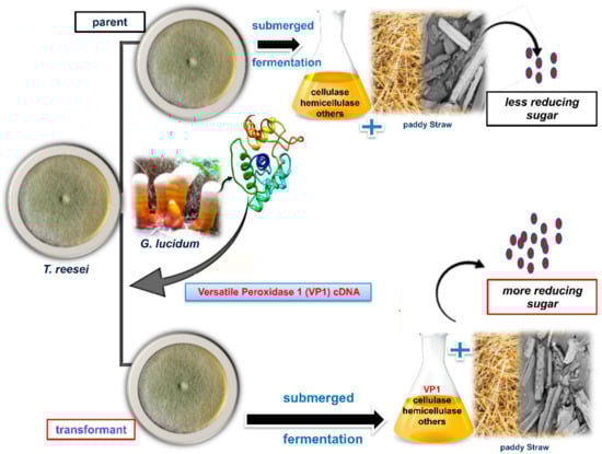 In the current study, the VP1 encoding gene (vp1) was cloned from G. lucidum RMK1 and heterologously expressed in T. reesei Rut-C30 under the control of a strong and inducible cbh1 promoter. The production of rVP1 by the transformed T. reesei Rut-C30 strain tVP7 improved the saccharification efficiency of T. reesei Rut-C30, which lacks efficient endogenous ligninolytic enzyme activity. These results make rVP1 a promising candidate for the efficient degradation of lignocellulosic biomasses (Figure 4). Such a genetic bioengineering approach could also provide an opportunity to heterologously express rVP1 in other industrial cellulase producing strains and reduce the costs of ligninolytic enzyme production for biofuel applications and lignin valorization.