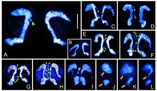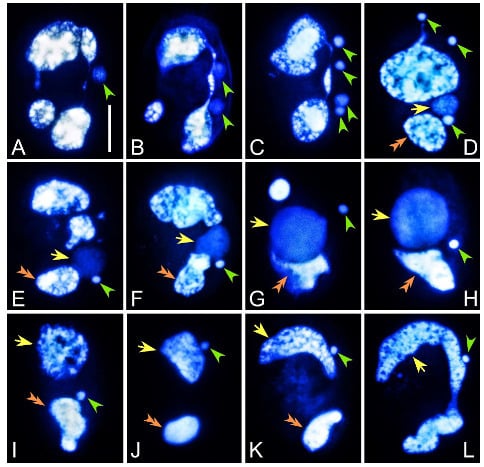 Nuclear events in conjugating pairs of Euplotes raikovi after Hoechst 33342 staining. (A) At the beginning of conjugation, the micronucleus (MIC) of each mating cell swells and migrates out of the concavity of the macronucleus (MAC). (B) After the first prezygotic division of the MIC. (C–F) Various stages of the first meiosis division. Cells in (C) is the zygotene stage of the first meiosis: the chromatin polymerizes into a typical ‘bouquet’ shape. In (E), cells have different numbers of nuclei due to asynchronous division. (G–J) Mating cells during the second meiotic division with different numbers of nuclear products due to asynchronous division. In (J), end of the second meiotic division results in eight haploid nuclei. (K) In each cell, two pronuclei (indicated by yellow arrows) swell while the other nuclei degenerate. (L) Synkaryon formation after exchange and fusion of pronuclei (orange double-arrowheads). Green arrowheads indicate nuclei derived from prezygotic divisions; yellow arrows indicate the pronuclei; orange double-arrowheads indicate the synkaryon. Scale bar = 20 μm.
