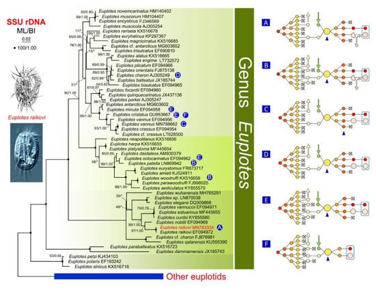 Maximum likelihood (ML) tree of the family Euplotidae based on SSU-rRNA gene sequences. Diophrys scutum (MQ603644) and Aspidisca aculeata (EF123704) were used as outgroup species. Numbers at nodes represent the bootstrap values of maximum likelihood (ML) out of 1000 replicates and posterior probability of Bayesian analysis (BI). Asterisk (*) indicates disagreement between ML and BI analyses. The scale bar corresponds to 5 substitutions per 100 nucleotide positions. (A–F) Different patterns of the nuclear events during conjugation in Euplotes species (reviewed from [23,24,27,28,33,49,50,51]).