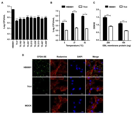 M. bovis mutants with altered binding properties. (A) Binding of M. bovis mutants to EBL cells. For each mutant, the binding to EBL cells was determined by counting the number of CFU associated with cell monolayers following incubation with 108 CFU. Data are mean mycoplasma titers from three independent assays. Standard deviations are indicated. (B–D) Adhesion of HB0801 and Mbov_0503 knock-out mutant T4.4 to EBL cells. (B) Influence of the temperatures on the binding capacity. For each mycoplasma strain, the binding to EBL cells was determined by counting the number of CFU/mL associated with cell monolayers following incubation with 108 CFU. Data are mean mycoplasma titers from three independent assays. Standard deviations are indicated. (C) Quantification of M. bovis binding to EBL membrane proteins. Microplates were coated with 100 ng or 200 ng EBL membrane extracts; 107 CFU of each strain were used. (D) Visualization of CFDA-SE labeled mycoplasmas bound to EBL cells by laser scanning confocal microscopy. Actin filaments and nuclei were labeled with Rhodamine phalloidin and DAPI, respectively. PBS was used as a negative control (MOCK).