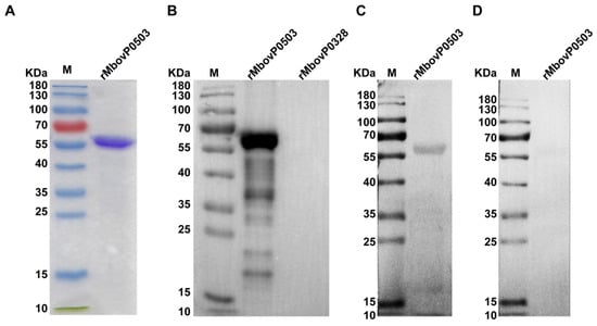 Immunoreactivity of rMbovP0503. (A) SDS-PAGE analysis of purified rMbovP0503. (B) Western blotting analysis of rMbovP0503 reactivity with the rMbovP0503 antiserum, (C) cattle antiserum against HB0801, and (D) negative cattle serum. The unrelated M. bovis recombinant protein rMbovP328 was used as a negative control. M: prestained protein ladder.