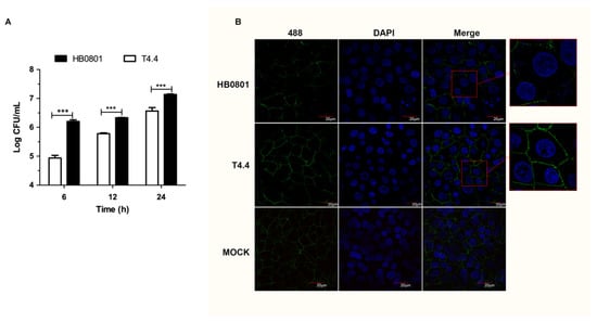 Mbov_0503 is not essential for M. bovis adhesion to host cells, and the disruption of this CDS is only associated with a partial reduction of its binding capacity. This prompted us to question the biological implications of Mbov_0503 disruption in M. bovis. Here, we tested the capacity of M. bovis to translocate across the epithelial cell barrier. Translocation assays carried out with HB0801 revealed that M. bovis was able to disseminate across MDBK cell monolayers (Figure 5A). Interestingly, translocation of mutant T4.4 across cell monolayers was significantly reduced at 6, 12, and 24 h postinoculation when compared to the parental strain (p < 0.001, student’s t-test). Growth curve experiments carried out with HB0801 and T4.4 failed to reveal any obvious influence of Mbov_0503 on mycoplasma proliferation (Figure S1).
