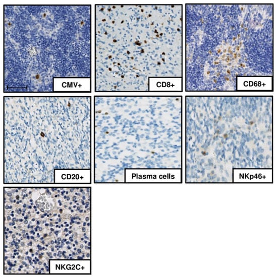 Detection: HCMV-positive cells as well as adaptive immune cells (CD8+, CD20+, plasma cells) and macrophages (CD68+) were detected in all infected cases (Figure 1). NKp46-positive cells were detected in all severe cases but in only four of seven moderately affected ones. HCMV-positive cells, plasma cells, NKp46-positive cells, and macrophages were not detected in the controls. The expansion of an NKG2C-positive clone is characteristic of CMV infection [,,,]. NKG2C immunostaining was negative in the controls, whereas NKG2C receptor staining was identified in 8 of the 11 severe cases and in 1 of the 7 moderately affected brains, (p = 0.049, OR 13.2 (IC95% [1.002; 819.6]).