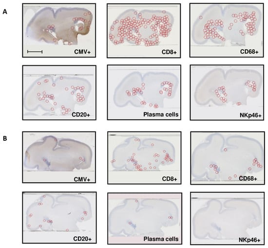 Repartition of HCMV-positive cells and immune cells (A) in one severely affected fetal brain sample (group A), successive cuts (case 8), and (B) in one moderately affected fetal brain sample (group B), successive cuts (case 17). Scale bar 35 mm.
