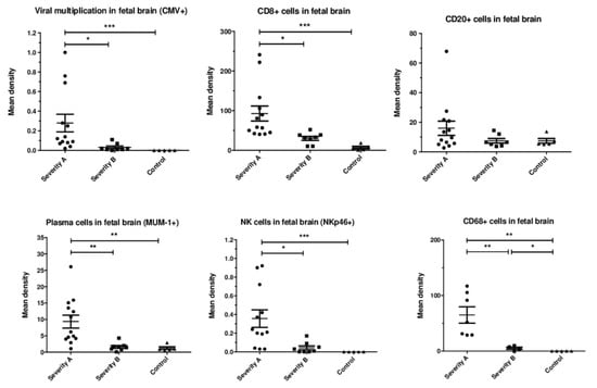 Quantification: Viral infection (density of HCMV-positive cells) was significantly higher in severely affected brains than in moderately affected ones (p = 0.03) (Figure 3). The staining densities of immune cells were higher in severe than in moderate cases and controls for CD8+ cells (p = 0.014, p = 0.0002, respectively), plasma cells (p = 0.007, p = 0.0032, respectively), NKp46+ cells (p = 0.02, p = 0.0007, respectively) and macrophages (p = 0.0061, p = 0.0025, respectively). However, they were similar for CD20+ cells (p = 0.6, p = 0.93, respectively). There was no significant difference in the staining densities of immune cells between moderately affected brains and controls, except for CD68+ (p = 0.048).