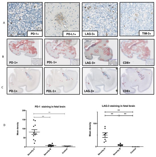 Detection, localization, and quantification of PD-1+ cells, PD-L1+ cells, LAG-3+ cells, and TIM-3+ cells in infected fetal brains. (A) Detection of PD-1, PDL-1, LAG-3, and TIM-3 immunostaining in one of the severely affected brains (case 7), scale bar 50 µm. (B) Localization of PD-1, PDL-1, LAG-3, and CD8 immunostaining in one of the severely affected brain samples and (C) in a moderate affected brain sample. (D) Mean immunostaining densities of PD-1 and LAG-3 according to the severity of the brain lesions: severe (group A), moderate (group B), and controls; ** p < 0.01, *** p < 0.001. Kruskal–Wallis test was used with Dunn’s Multiple Comparison’s Test and Mann–Whitney test.