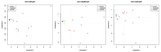 A principal component analysis was performed to bring out density patterns of HCMV-positive cells, adaptive responses (CD8+ cells and plasma cells/MUM-1) and innate response (NK cells and macrophage/CD68), and markers of cellular exhaustion (PD-1/LAG-3) according to cerebral severity (groups A, B, or control). A strong link was found between brain lesion severity (severe, moderate, and not-infected) and 1) expression of HCMV/CD8/PD-1 and 2) expression of HCMV/NKP46/PD-1 (Figure 5). In contrast, the expression of HCMV/CD8/CD20/MUM1, HCMV/CD8/CD20/MUM1/PD-1/LAG-3, HCMV/CD20/PD-1 (Figure 5), HCMV/MUM-1/PD-1, HCMV/CD20/LAG-3, HCMV/MUM-1/LAG-3, HCMV/NKp46/CD68/PD-1/LAG-3, HCMV/NKp46/PD-1, HCMV/CD68/PD-1, HCMV/NKp46/LAG-3, and HCMV/CD68/LAG-3 demonstrated a weak or inexistent link with brain lesions’ severity.