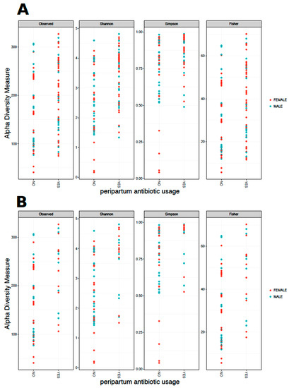 (a) Alpha diversity of 105 meconium samples stratified by peripartum antibiotic use (yes/no) and sex. Peripartum antibiotic use was associated with higher Shannon and Simpson diversity (p < 0.05), but a lower number of OTUs and Fisher diversity (p < 0.05). (b) Alpha diversity of meconium samples from infants born by vaginal delivery, stratified by peripartum antibiotic use (yes/no) and sex. Peripartum antibiotic use was associated with higher alpha diversity according to all four measures (p < 0.05, two sample Wilcoxon test).