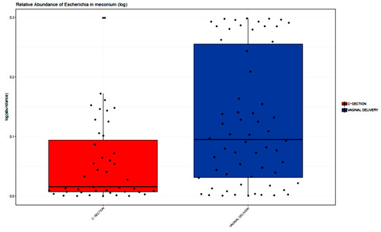 Relative abundance of Escherichia in meconium samples stratified by delivery mode. For each colored box: Horizontal bar = median, lower bar = first quartile (25th percentile), and upper bar = third quartile (75th percentile). Escherichia was higher in meconium samples from infants born by VD (38%) compared with CS (15%), FDR adjusted p < 0.001.