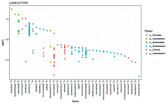 Differentially abundant OTUs (FDR < 0.05) according to delivery mode (negative log fold change (logFC) indicates OTU is enriched in meconium from CS infants, positive logFC indicates OTU is enriched in meconium from VD infants).