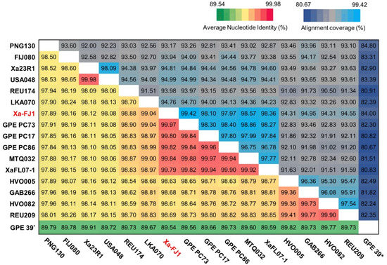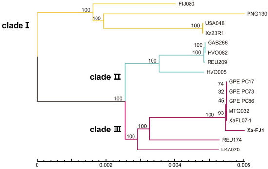 3.3. Average Nucleotide Identity and Phylogenetic Analysis among Strains of X. albilineans