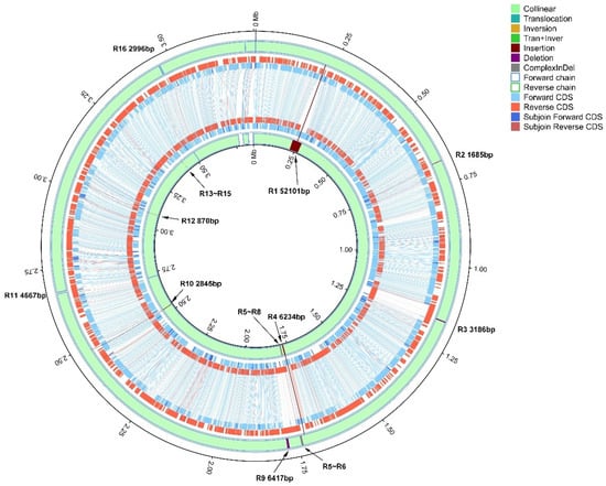 | R6 | 1,736,873 | 1,741,929 | 1,791,101 | 1,795,842 | Complex Indel | 5057 | 4742 | Prophage integration | |
