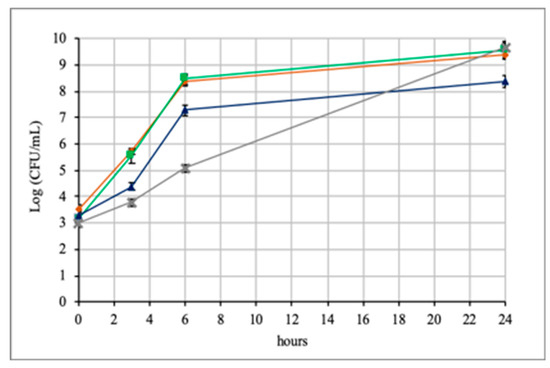 Figure 1 shows the results obtained by the growth in co-culture. For A. muciniphila DSM 22959 significant differences were observed if it grew alone or in co-culture with Lb. rhamnosus GG. In the first hours A. muciniphila grew faster alone than in co-culture, and this difference was particularly evident at 6 h. Subsequently, the situation completely changed and at 24 h, A. muciniphila DSM 22959 alone reached 8.4 Log CFU/mL, while in co-culture it reached a value of 9.6 Log CFU/mL. Therefore, even if the growth of A. muciniphila in co-culture was initially slower, it was favored by the presence of Lb. rhamnosus GG during time.