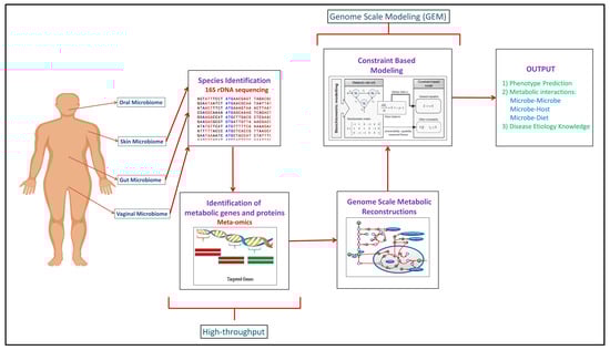 Building upon the increased experimental data generated through the high-throughput approaches, computational modeling approaches such as genome scale metabolic models (GEMs) have been developed to integrate and analyze data to study function (Figure 1). In recent years, meta-omics data have been used in conjunction with genome scale metabolic models (GEMs). This is illustrated in Table 1, where omics and meta-omics data were used in the majority of the GEM studies. Genome scale metabolic models and metagenomics data is taken as an input when you are using MAMBO (Metabolomic Analysis of Metagenomes using fBa and Optimization) [19]. This research study used this approach where they incorporated 1500 microbes in their model and showed that a distinct metabolome exists at vagina, stool, skin and oral sites in the human body [19]. Use of in vitro, ex vivo and in vivo experimental data with in silico models serve as the excellent research pipeline to discover the unknown microbe–microbe and microbe-host metabolic interactions in human microbiomes suggesting crucial therapeutic advancements [14]. While each of the respective omic data types provide useful information in characterizing organism function, some of the data types are more directly converted to the modeling formalism than others. For example, Vanee et al. used a proteomics derived model to understand the metabolism functionalities of the microbe Thermobifida fusca where the growth rates shown by experimental and in silico data were almost similar [20]. If experimental and computational work is properly used collaboratively, there will be identification of not only the representative species of the human microbiome but of the other unknown species with whom these leader microbes coordinate through vast number of metabolite exchanges [21].