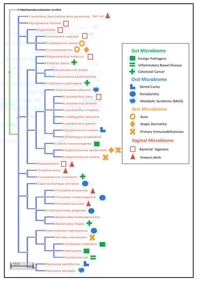 Phylogenetic tree for the all the human microbes present at the 4 antomical sites (gut, oral, skin, vagina). The disease caused by the resident human microbes is shown by a particular shape.