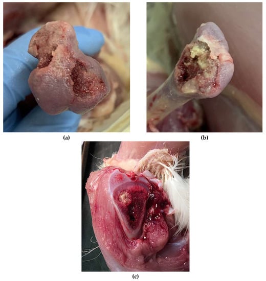 - McNamee, P.T.; Smyth, J.A. Bacterial chondronecrosis with osteomyelitis (’femoral head necrosis’) of broiler chickens: A review. Avian Pathol. 2000, 29, 253–270. [Google Scholar] [CrossRef]