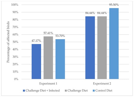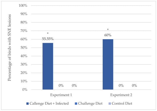 Incidence of subclinical necrotic enteritis (SNE) during Experiments 1 and 2. Randomly selected birds from each treatment group were necropsied at 31 days of age (Experiment 1, 9 birds/group; Experiment 2, 5 birds/group). Asterisks (*) denote statistically significant differences (p < 0.05) in the incidence of SNE between the Challenge Diet + Infected and Challenge Diet groups.