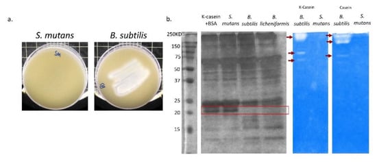 2.9. Casein Breakdown in Solution by B. subtilis and S. mutans Lysate