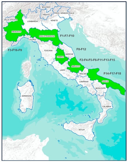 The sampling was carried out in a pig slaughterhouse located in the Abruzzo region of Italy. The sampling activities were carried out during sixteen sessions along the whole year, with four sessions for each season. A total of 12,308 animals were slaughtered, among which 280 animals were randomly selected (1 carcass for every 40–50 animals, about 17–18 animals sampled for each visit). This sample size was calculated to be able to estimate the prevalence of contamination with 6% of precision, considering 50% of expected prevalence and 95% of confidence level []. For all the animals sampled, the fattening phase of pigs was carried out in Italy, in 18 farms (coded F1 to F18) located in different regions of north (Piemonte, F3, F16, F9 and Emilia Romagna F1, F7, F10), central (Umbria F8, F12 and Abruzzo F2, F4, F5, F6, F11, F13, F15) and south Italy (Puglia F14, F17, F18) Figure 1. From each animal, the faecal content was taken immediately after the evisceration phase while swab samples from carcasses were collected before cooling, with a sampled surface of 400 cm2 for each carcass (withdrawal points: ham, back, belly, jowl). All samples were transported at 4 °C in refrigerated boxes and processed immediately on return to the laboratory.