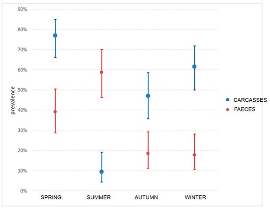 Prevalence and CI in carcasses and faeces during seasons.
