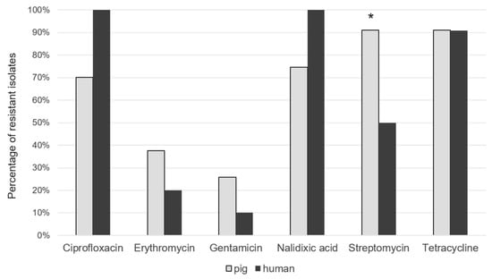 Percentage of resistant C. coli isolates from pig and humans. * p ≤ 0.5.