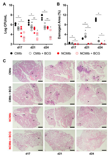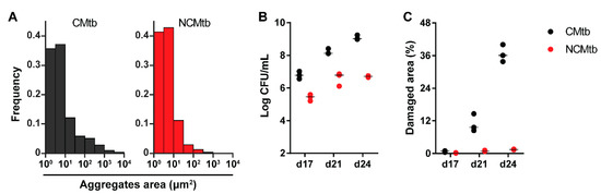 Figure 1A shows the areas of the particles measured, under ×100 amplification, demonstrating cording formation in the CMtb compared to NCMtb [17]. Despite challenging with the same CFU, CMtb increased BL and damaged area in lung when compared with NCMtb (Figure 1B,C). It is noteworthy that after a slight increase, by day 21 the progression of NCMtb reached a plateau of BL, causing almost no damage to lungs. CMtb caused mainly exudative lesions from day 17, and at day 21, large necrotic lesions were detected. In the case of NCMtb, proliferative and incipient exudative lesions of smaller sizes were seen even when the latter were not detected until day 21 (Figure S1).