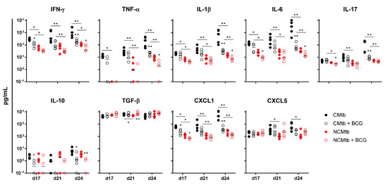 IFN-γ and CXCL-5 levels did not show major changes over time in any experimental group (Figure 4). On the contrary, IL-1β, IL-6, IL-17 and CXCL-1 levels exhibited a progressive increase in the non-vaccinated CMtb group, while keeping relatively constant in the others. Overall, BCG vaccination reduced the levels of all cytokines and chemokines except TGF-β and CXCL-5. Of all of them, it is interesting to note that on day 17, BCG vaccination significantly reduced CXCL-1 levels in both CMtb and NCMtb. At this time-point, vaccination also reduced the levels of IFN-γ and IL-10 in CMtb and IL-6 and IL-17 levels in the case of NCMtb. TNF-α levels also experimented an increase in NCMtb, which was delayed after BCG vaccination (Figure 4). Thus, vaccination with BCG was able to stop the progression of Mtb in both cording and non-cording bacilli by significantly modulating the immune response and therefore the damaged area (Figure 3).