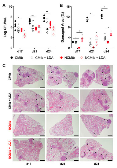 In the case of CMtb infection, BL reduction after LDA was equivalent to BCG vaccination (Figure 5), also reducing the neutrophil infiltration and increasing the lymphocytic one (Figure S1). LDA infection only reduced significantly the BL of NCMtb at day 17 PI but increased the damaged area (Figure 5).