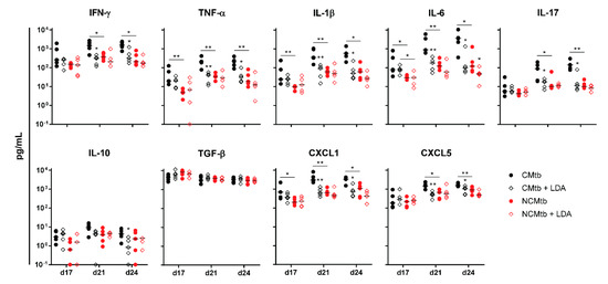 In terms of the immune response, this can also be correlated with the presence of high levels of IFN-γ at the beginning of the infection in all experimental groups (i.e., >102 pg/mL), unlike the case of BCG vaccination (Figure 6). This uniform response was not reflected in the BL, showing different values led by the group that was only challenged with the CMtb. Contrary to what happened with BCG vaccination, the kinetics of the inflammatory response appear to follow the same shape in all groups, reaching a plateau at day 21. Of note, at day 17 BL appears to be slightly higher than in the previous experiment, so the infection is at a much more mature stage. Interestingly, at day 17 CXCL-1 was also reduced by LDA infection in the CMtb, although not significantly. In the case of NCMtb, LDA did not change the levels of cytokines and chemokines.