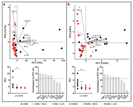 Comparison of PCA of inflammatory mediators after BCG vaccination (A) or LDA infection (B) in lung homogenates. PCA biplot showing each animal and variable (top). PC1 scores for each animal, lines are means; ANOVA and Sidak’s multiple comparisons test (** p < 0.01, *** p < 0.001) (bottom left). Mediators’ contribution to PC1 (bottom right).