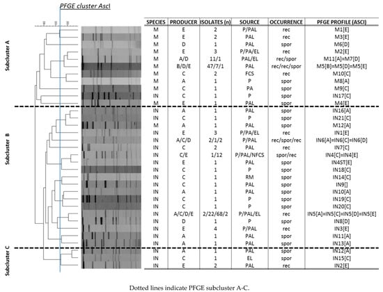 PFGE-types with identical AscI profiles assigned to dairy producers A-E and isolated during two or more sampling events were classified as recurrent, whereas Listeria isolates with unique AscI profiles and isolated once were defined as sporadic genotypes. Listeria spp. genotypes recurrently isolated over a period of six or more months were defined as persistent. Generally, L. monocytogenes clustered together in a distinct subcluster A and could be clearly distinguished at a similarity level of 25% from L. innocua subcluster B and C (similarity level 40%) (Table 1, Figure 1).