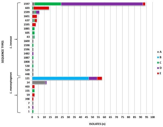 Comparison of the L. innocua and L. monocytogenes STs identified in this study to the Institute Pasteur MLST isolate database (https://bigsdb.pasteur.fr/listeria/listeria.html) was performed to identify highly abundant housekeeping genes, CC and STs (Table S1). Interestingly, some housekeeping genes were not specific for L. monocytogenes genetic lineage III or L. innocua.