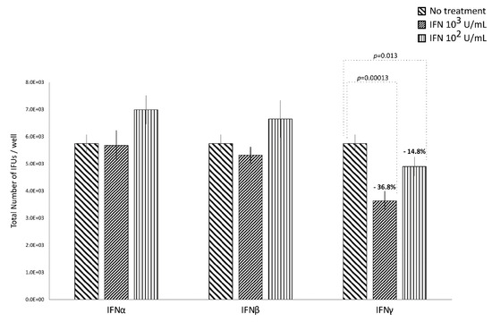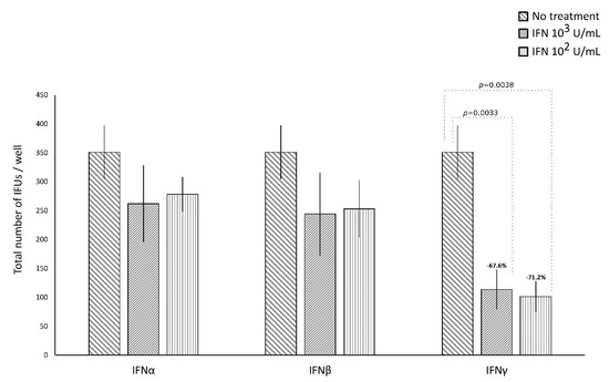 Anti-chlamydial activity of IFNα, IFNβ, and IFNγ following the post-infection treatment of human synovial fibroblasts. Confluent monolayers were infected with C. trachomatis and, then, treated with the IFNs (102 or 103 IU/mL) for 24 h. The total number of Inclusion Forming Units (IFUs) was determined by fluorescence microscopy, counting all green-stained inclusions at 400× magnification.