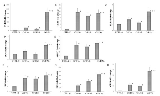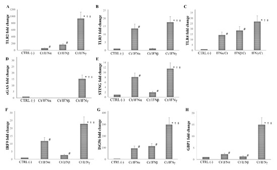 Expression of innate immune response-related genes following the post-infection treatment of C. trachomatis in human synovial fibroblasts. Synovial cells were infected with C. trachomatis and, then, treated with IFNα, IFNβ, or IFNγ (103 IU/mL) for 24 h. Data are expressed as fold change value (2−ΔΔCt method) in mRNA levels compared to baseline values observed in untreated and uninfected synovial cells [set to 1 and indicated in the graphs as CTRL (-)]. Expression of (A) TLR2, (B) TLR3, (C) TLR4, (D) cGAS, (E) STING, (F) IRF9, (G) ISG56, and (H) GBP1. * p < 0.01 vs. CTRL (-); # p < 0.05 vs. CTRL (-); † p < 0.05 vs. Ct/IFNα; ‡ p < 0.05 vs. Ct/IFNβ.