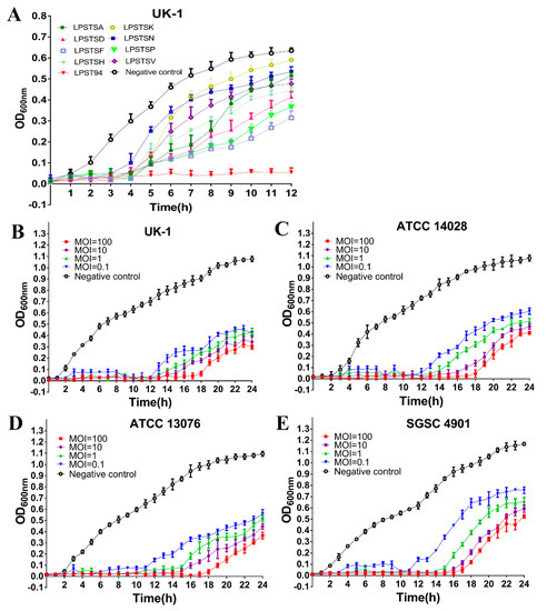 (A) Comparison of the lytic ability of selected phages using S. enterica serovar Typhimurium (UK-1) as a host at multiplicity of infection (MOI) of 1 in tryptone soy broth; Lytic ability of phage LPST94 to lyse S. Typhimurium and S. Enteritidis in tryptone soy broth medium at MOIs of 100, 10, 1, and 0.1 at 37 °C in vitro. (B) S. Typhimurium UK-1, (C) S. Typhimurium ATCC 14028, (D) S. Enteritidis ATCC 13076, and (E) S. Enteritidis SGSC 4901. Values represent means with the standard deviation of three replicates of each time point.