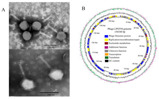 Prior to transmission electron microscopy, high titer phage LPST94 was obtained by pelleting phage with ultracentrifugation at 40,000× g for 1 h, followed by re-suspending pellet in small volumes. Phage LPST94 was diluted into phosphate-buffered saline (PBS) and was negatively stained with 0.5% phosphotungstic acid (PTA) [34,39]. Thereafter, the phage was fixed on a copper grid and the images of the phages were captured using a Philips CM12 transmission electron microscope (Hitachi H-7000FA, Tokyo, Japan), at Wuhan Institute of Virology (China Academy of Sciences, Wuhan, China) and analyzed via Digital Micrograph Demo 3.9.1 software.