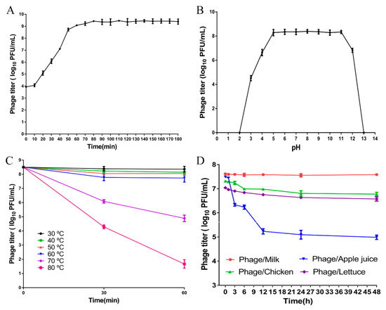 Phage stability experiments were conducted according to a previously described method [47] with little modification. Briefly, the phage was added in the milk, apple juice, chicken breast, and lettuce to reach a final titer of 7 log10 PFU/mL. All inoculated samples (milk, apple juice, chicken breast, and lettuce) were incubated at 25 °C for 0, 1, 3, 6, 12, 24, and 48 h. At each time-point, food samples (milk or apple juice or pre-cut chicken breast or lettuce) were taken to measure phage titer by using double-layer agar method.
