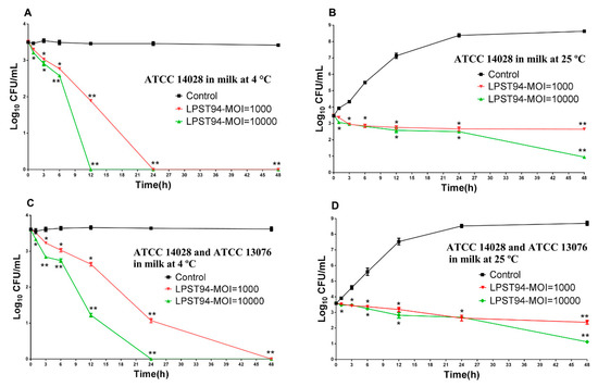 Effectiveness of phage LPST94 in reducing the S. Typhimurium ATCC 14028 and S. Enteritidis ATCC 13076 in milk. (A) Effect of phage LPST94 on growth of S. Typhimurium ATCC 14,028 in milk at 4 °C, (B) Effect of phage LPST94 on growth of S. Typhimurium ATCC 14028 in milk at 25 °C, (C) Effect of phage LPST94 on growth of Salmonella mixture (S. Typhimurium ATCC 14028 and S. Enteritidis ATCC 13076) in milk at 4 °C, and (D) Effect of phage LPST94 on growth of Salmonella mixture (S. Typhimurium ATCC 14028 and S. Enteritidis ATCC 13076) in milk at 25 °C. Values represent mean with standard deviation of three determinations. ** Significance of p < 0.01; * Significance of p < 0.05.