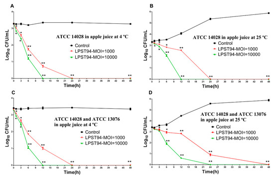 Effectiveness of phage LPST94 in reducing the S. Typhimurium ATCC 14028 and S. Enteritidis ATCC 13076 in apple juice. (A) Effect of phage LPST94 on growth of S. Typhimurium ATCC 14028 in apple juice at 4 °C, (B) Effect of phage LPST94 on growth of S. Typhimurium ATCC 14028 in apple juice at 25 °C, (C) Effect of phage LPST94 on growth of Salmonella mixture (S. Typhimurium ATCC 14028 and S. Enteritidis ATCC 13076) in apple juice at 4 °C, and (D) Effect of phage LPST94 on growth of Salmonella mixture (S. Typhimurium ATCC 14028 and S. Enteritidis ATCC 13076) in apple juice at 25 °C. Values represent mean with standard deviation of three determinations. ** Significance of p < 0.01; * Significance of p < 0.05.