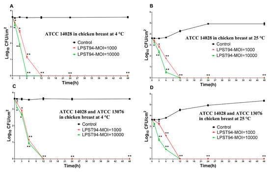 Effectiveness of phage LPST94 in reducing the S. Typhimurium ATCC 14028 and S. Enteritidis ATCC 13076 in chicken breast. (A) Effect of phage LPST94 on growth of S. Typhimurium ATCC 14028 on chicken breast at 4 °C, (B) Effect of phage LPST94 on growth of S. Typhimurium ATCC 14028 on chicken breast at 25 °C, (C) Effect of phage LPST94 on growth of Salmonella mixture (S. Typhimurium ATCC 14028 and S. Enteritidis ATCC 13076) on chicken breast at 4 °C, and (D) Effect of phage LPST94 on growth of Salmonella mixture (S. Typhimurium ATCC 14028 and S. Enteritidis ATCC 13076) on chicken breast at 25 °C. Values represent mean with standard deviation of three determinations. ** Significance of p < 0.01; * Significance of p < 0.05.